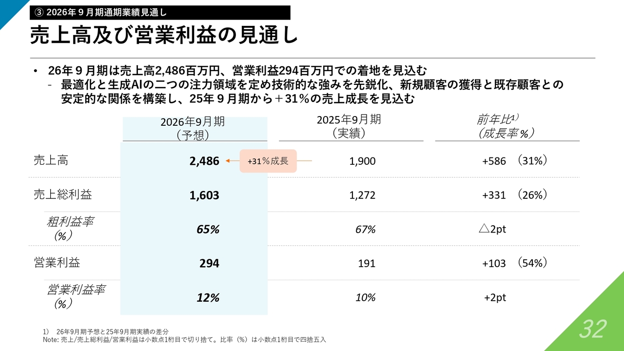 スライド一番左に記載した2026年9月期予想に基づき、売上高は24億8,600万円を見込んでいます。こちらは、2025年9月期実績である19億円から31パーセントの成長となります。