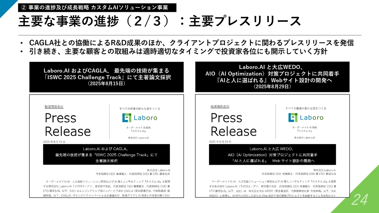 また、CAGLA社のグループ参入によって、同社との連携がカスタムAIソリューション事業に影響を与え、良い進展があったと考えています。