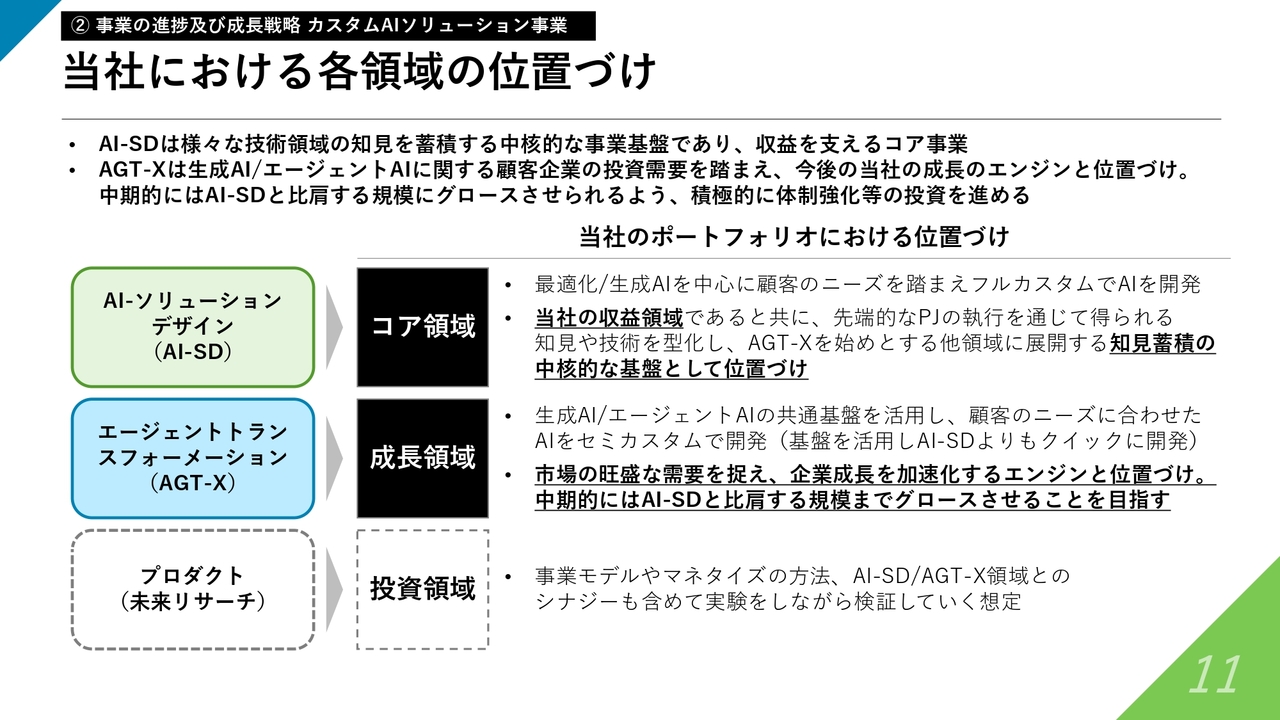 2つ目のエージェントトランスフォーメーションは成長領域に位置づけています。こちらは現在、市場で非常に強いニーズがあり、需要が拡大しているため、この需要を確実に捉え、対応していきます。その中で、中期的にはAIソリューションデザイン事業と同規模、あるいはそれを超える規模まで成長させる、新しい成長の柱として位置づけています。