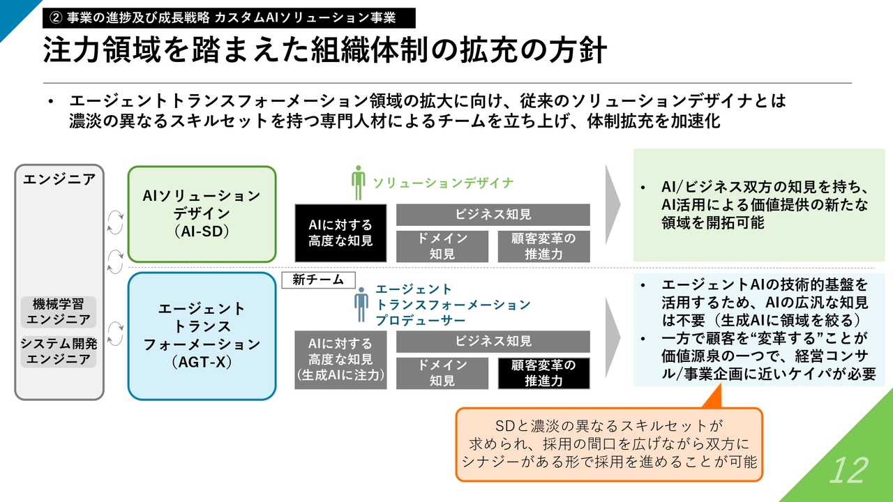 コンセプトとしては、エージェントに関する取り組みが進む中で、コンサルティング事業の支援領域とカスタムAIの領域が、世の中でもより一層シナジーを生むフェーズになっていくだろうと考えています。