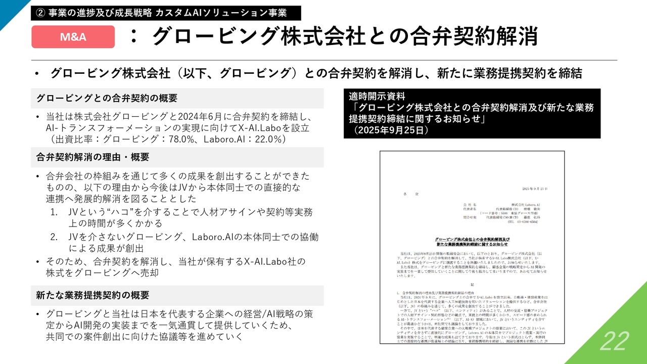 M&Aの取り組みについてです。グロービング株式会社との合弁契約を解消した上で、新たに本体同士の提携に進展しました。