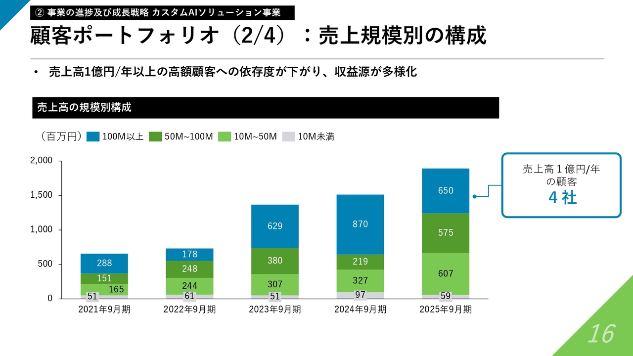 売上規模別についてです。売上高が年間1億円以上の顧客は計4社で、年々全体の分散度合いが上がってきています。これによって収益源が多様化し、一極集中のリスクが低減するかたちで展開が進んでいます。