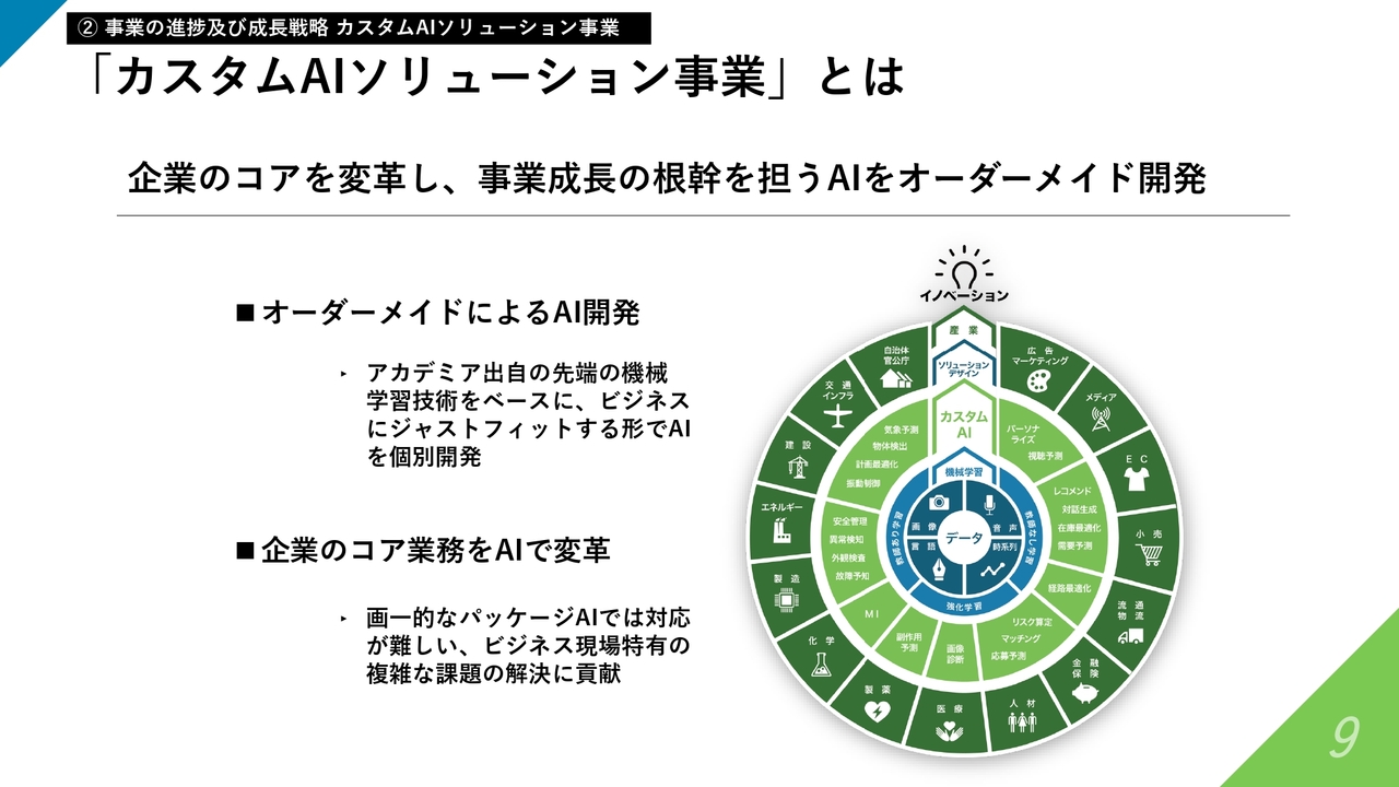 それでは、事業の進捗と今後の成長戦略について、セグメントごとにご報告します。まずはカスタムAIソリューション事業について、あらためてご説明します。