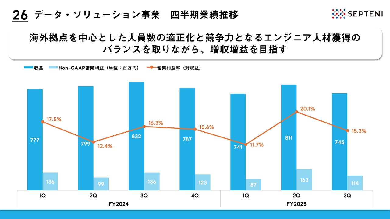 データ・ソリューション事業の四半期業績推移を示しています。海外拠点を中心とした人員数の適正化と、競争力となるエンジニア人材獲得のバランスをとりながら、引き続き増収増益を目指していきます。