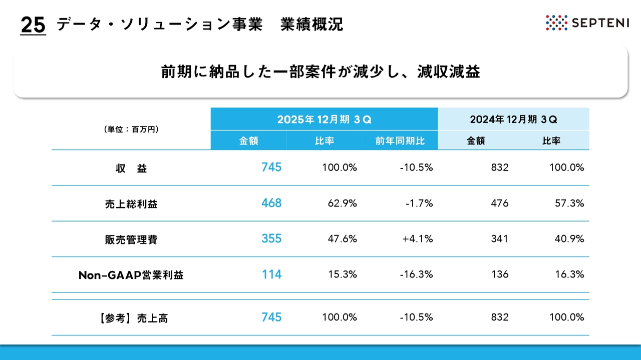 前期に納品した一部案件の終了に伴い、収益は約7億5,000万円で前期比マイナス10.5パーセントの減収となりました。Non-GAAP営業利益は約1億1,000万円で、前期比マイナス16.3パーセント、金額にして約2,000万円の減少となり、セグメント全体としては減収減益の結果となっています。