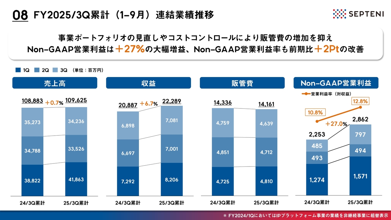第3四半期累計の連結業績推移です。対売上高収益率の改善に加え、事業ポートフォリオの見直しやコストコントロールにより販管費の調整を行い、Non-GAAP営業利益は前期比プラス27パーセントと大幅な増益となりました。