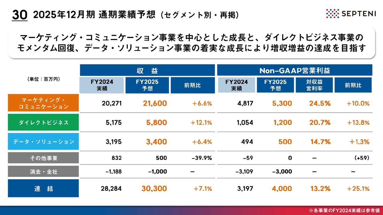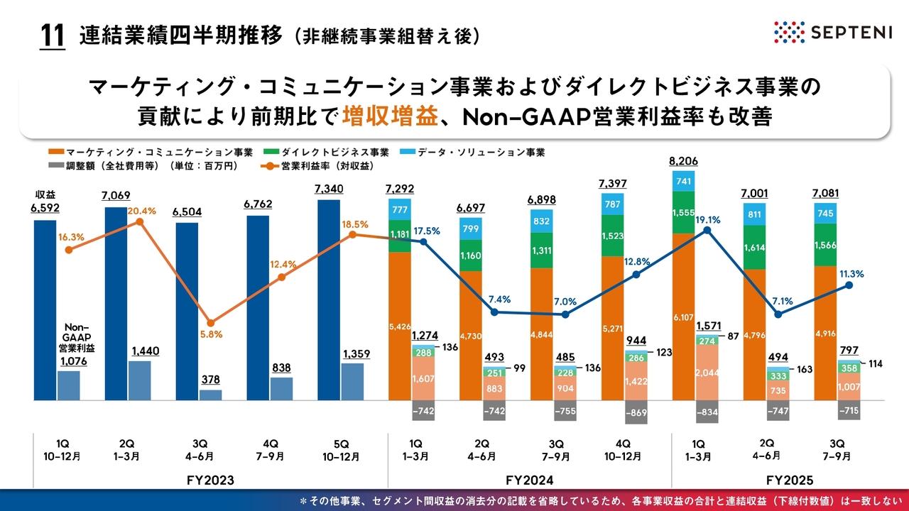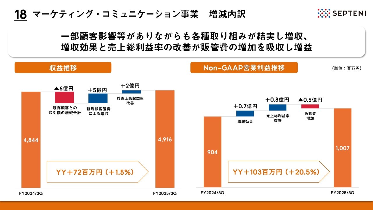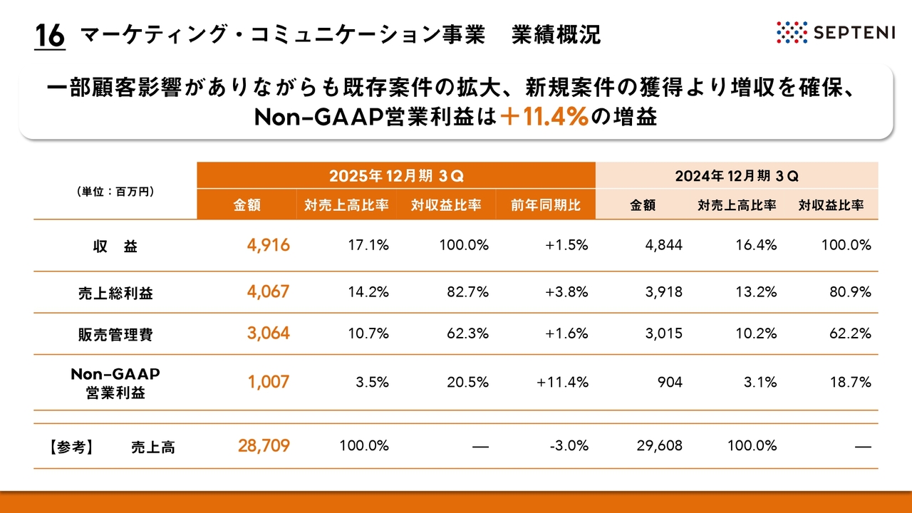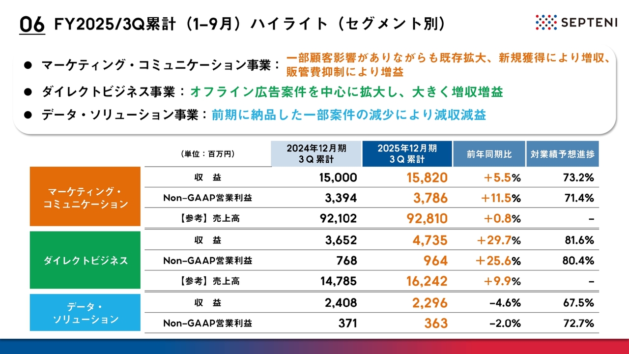 マーケティング・コミュニケーション事業およびダイレクトビジネス事業の貢献により、前期比で増収増益を達成し、Non-GAAP営業利益率も改善しました。