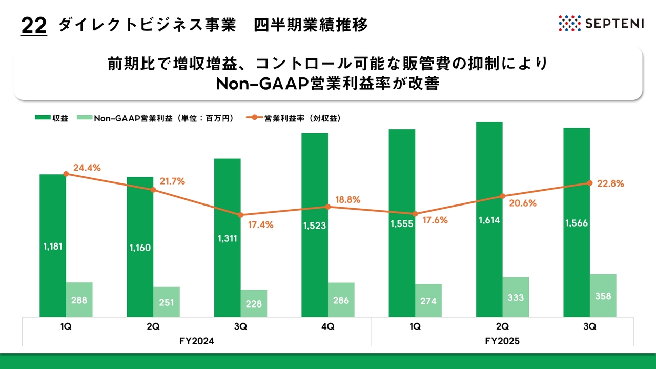 ダイレクトビジネス事業の四半期業績推移を示しています。制作原価が増加し始めた2024年度第3四半期を底に、Non-GAAP営業利益率は徐々に改善し、第2四半期に続いて20パーセント台まで回復しています。