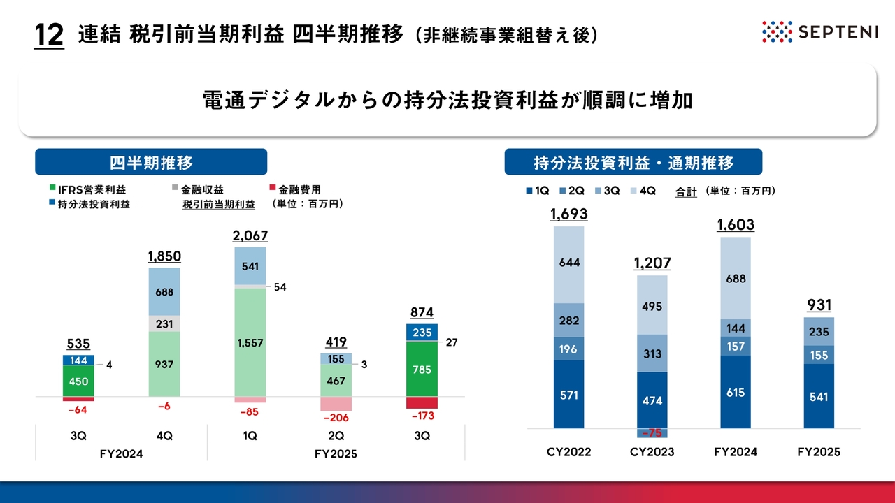 税引前当期利益までの分解と持分法投資損益の累計推移を示しています。株式会社電通デジタルを中心とした持分法投資利益は、第3四半期で約2億4,000万円と順調に増加しています。