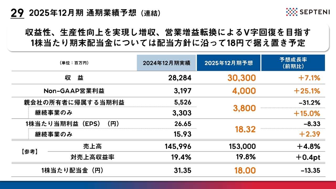 以上が私からの2025年12月期第3四半期決算の説明です。今期掲げてきた増収の継続と営業増益転換によるV字回復の実現を目指して邁進していきます。
