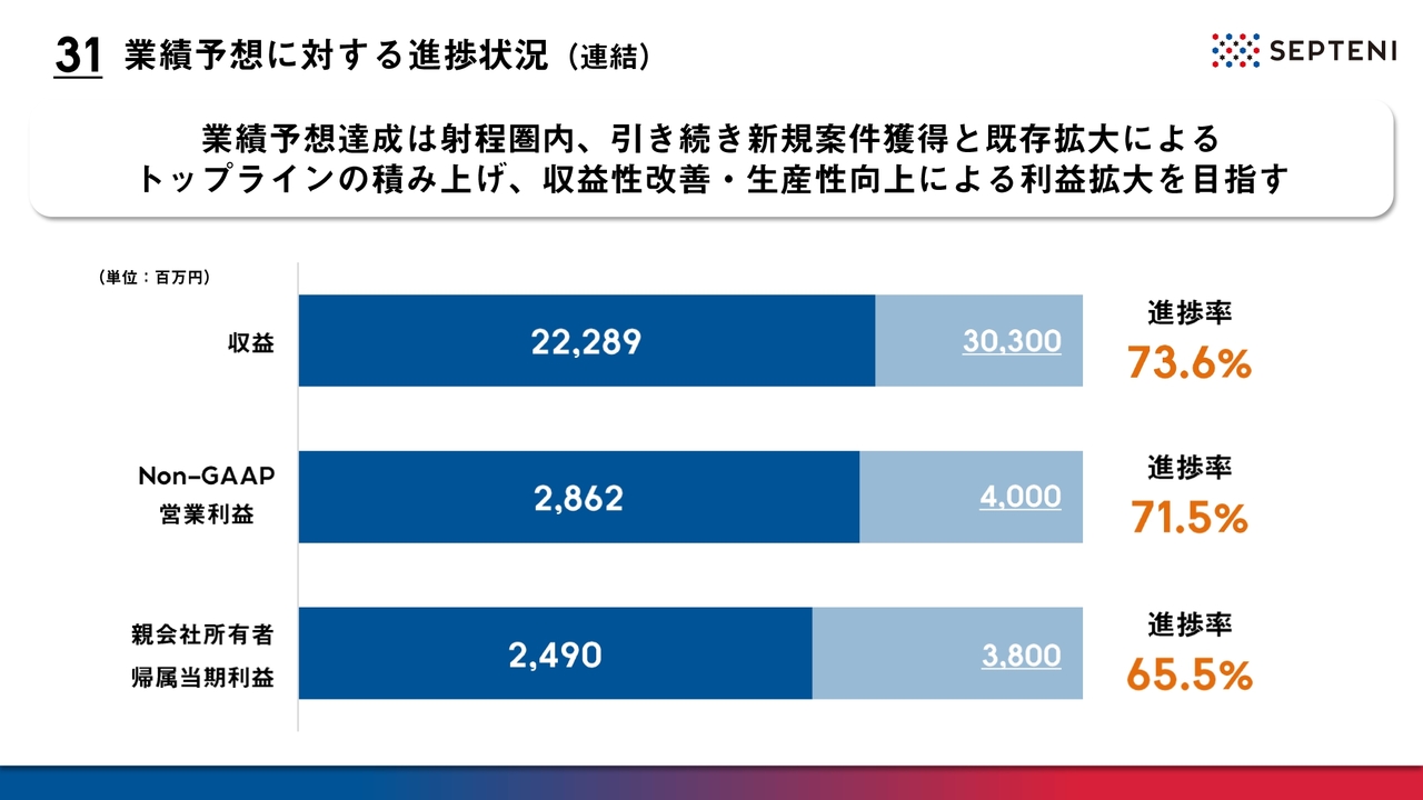 また、通期の業績予想に対する進捗状況としても、収益およびNon-GAAP営業利益ともに70パーセントを超えており、順調に推移していると実感しています。