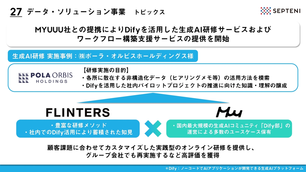 株式会社MYUUUとの業務提携においては、ノーコードでAIアプリケーションを開発できる生成AIプラットフォーム「Dify」を活用した生成AI研修サービスおよびワークフロー構築支援サービスの提供を開始しています。