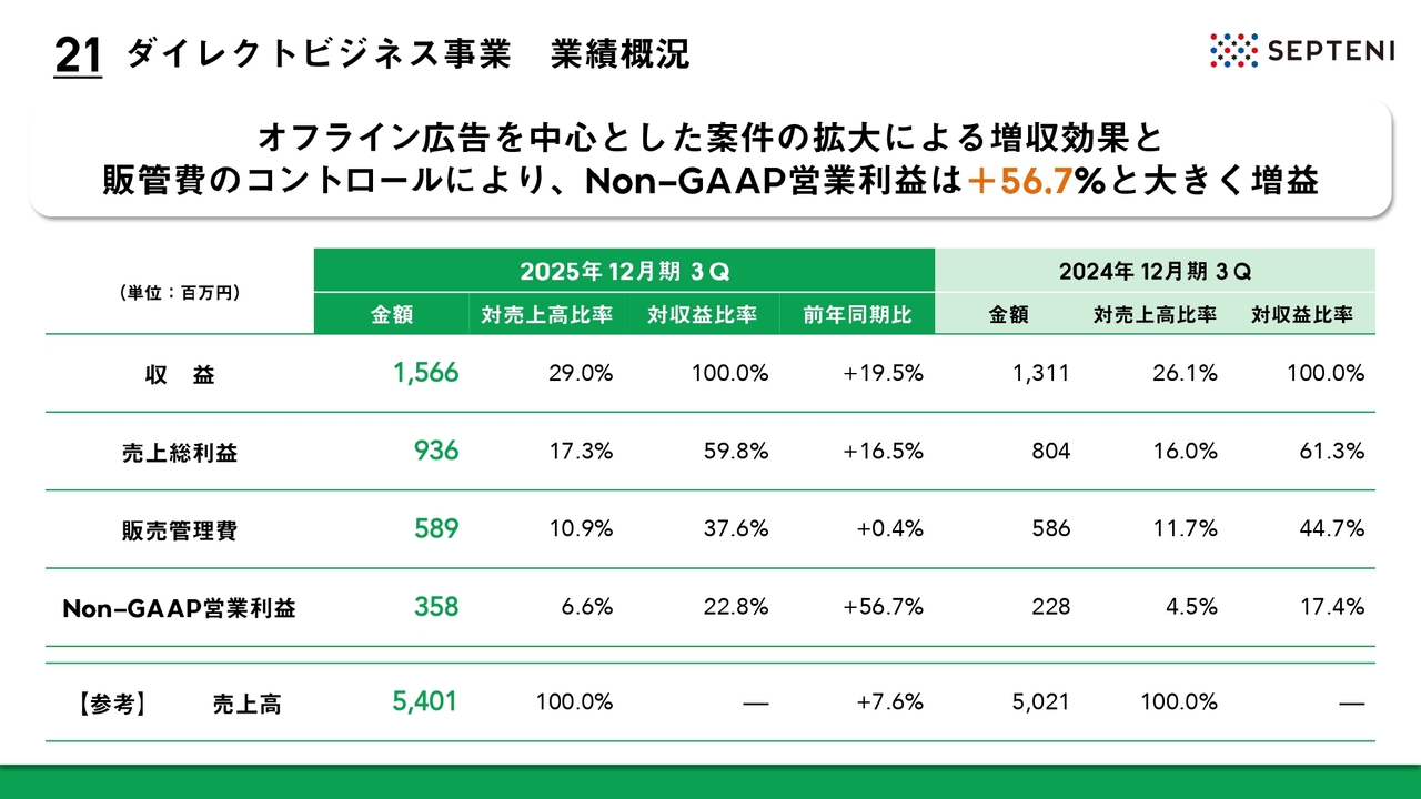 ダイレクトビジネス事業は、オフライン広告案件を中心に拡大し、大幅な増収増益を果たしました。