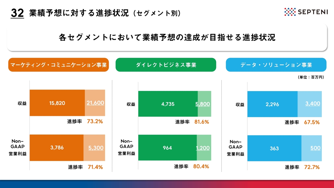 セグメント別の業績予想に対する進捗状況です。各セグメントとも計画に沿って順調に進捗しており、引き続き通期業績予想の達成を目指していきます。