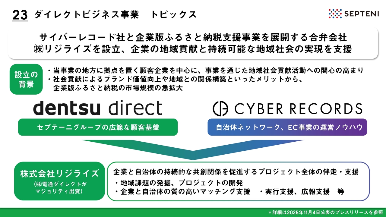 ダイレクトビジネス事業に関するトピックスをご紹介します。11月4日に、株式会社サイバーレコードと企業版ふるさと納税支援事業の展開に向けて、合弁会社を設立しました。