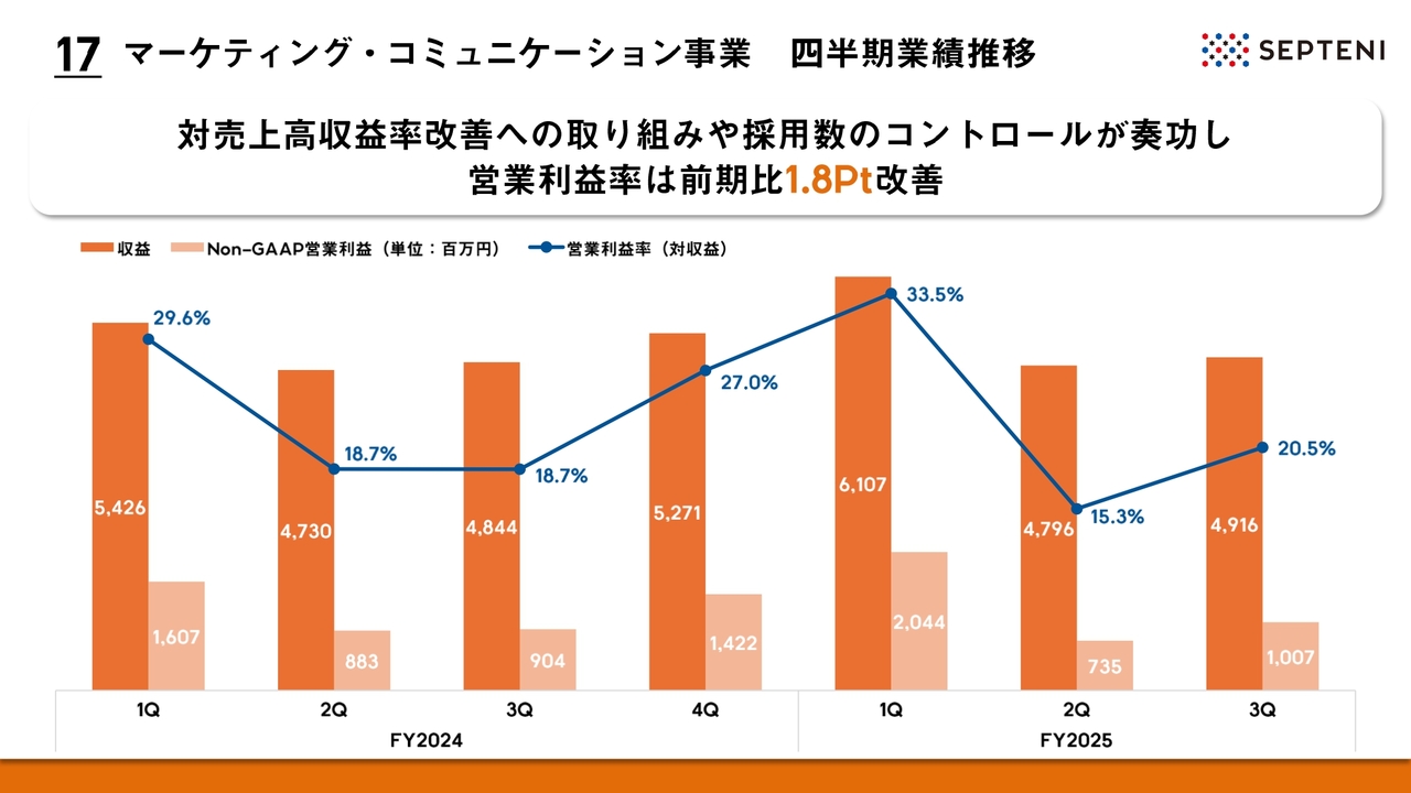 マーケティング・コミュニケーション事業の四半期業績推移です。今期よりセグメントを変更したため、変更後のセグメント実績は直近7四半期分を記載しています。