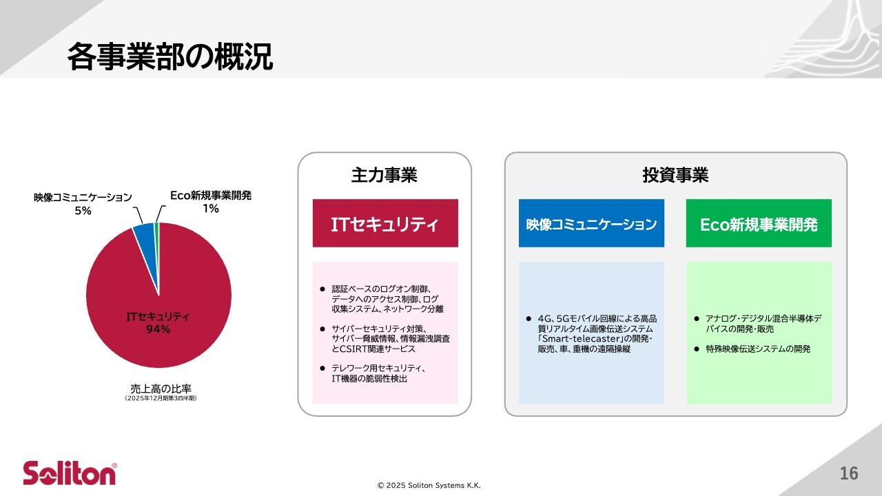 続いて、主力事業であるITセキュリティ事業、そして投資事業として映像コミュニケーション事業およびEco新規事業開発の3事業の業績概況についてご説明します。
