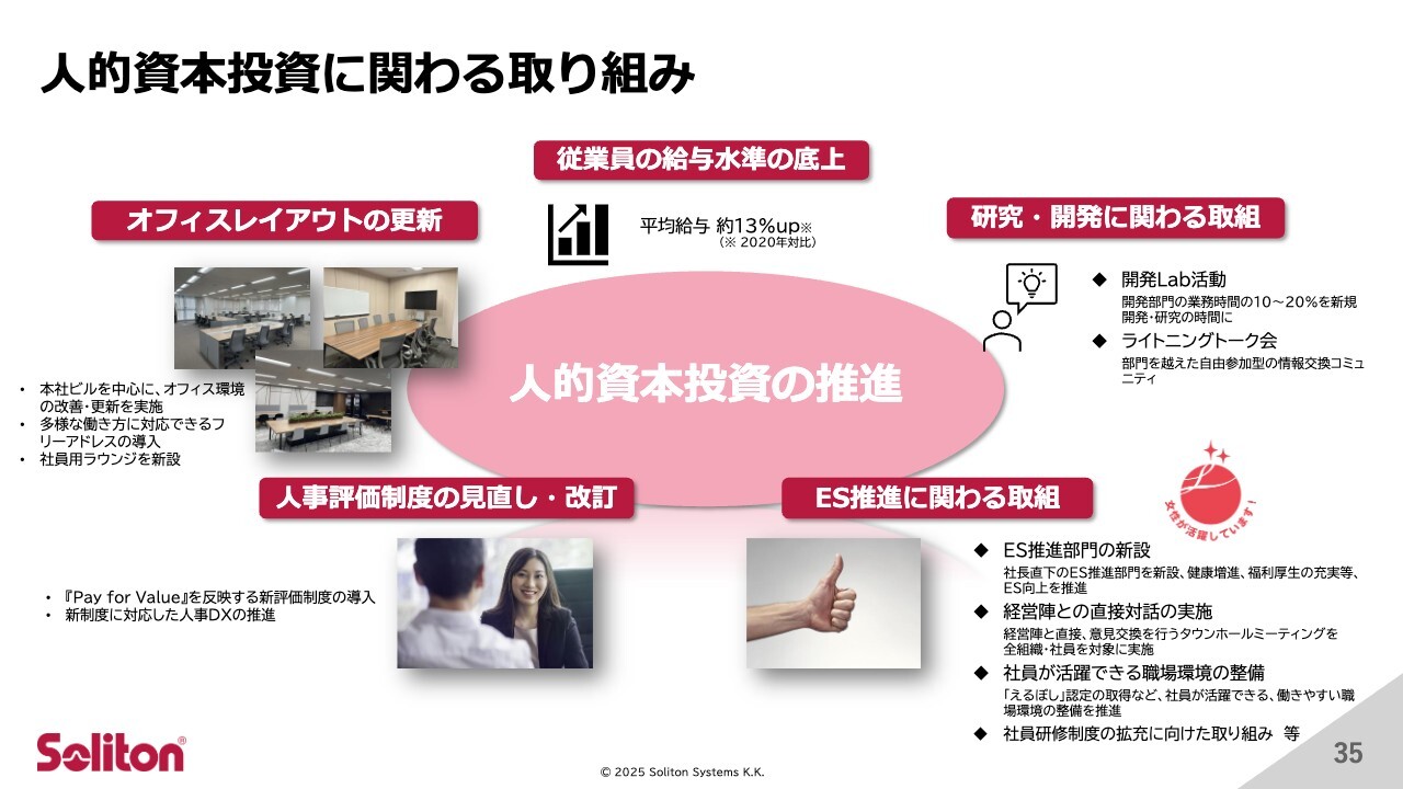 これらの施策に加え、平均給与は2020年比で13パーセント上昇しています。従業員の満足度と生産性の向上に直結する人的資本投資を引き続き重点的に行っていきます。