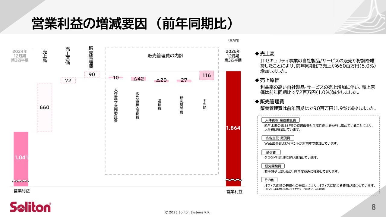 営業利益は、利益率の高い自社製品・サービスの売上増加に加え、オフィス環境の見直しなどによる販売管理費の削減も寄与し、18億6,400万円となり、前年同期比79パーセント増と大幅に増加しました。
