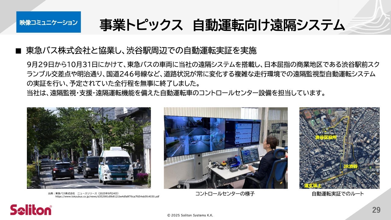 続いて、自動運転に関するトピックです。東急バス株式会社と協業し、人や車の往来が非常に多い東京・渋谷駅周辺で、自動運転の実証実験を実施しています。渋谷駅前のスクランブル交差点や明治通り、国道246号線など、電動スクーターなど車以外の乗り物も頻繁に走行する、道路状況が非常に複雑な環境での遠隔監視型自動運転システムの実証を行っています。