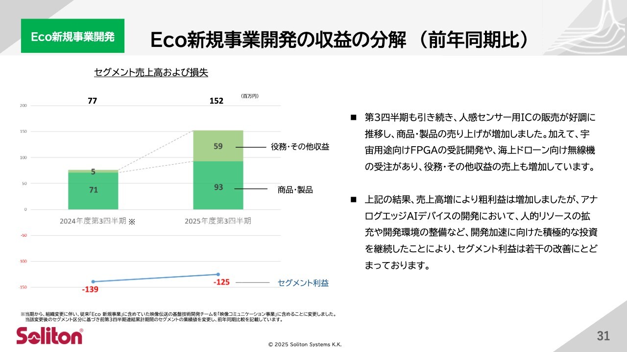 続いて、Eco新規事業開発の概況についてご説明します。Eco新規事業開発の収益について、第3四半期も引き続き、人感センサー用ICの販売が堅調に推移し、商品および製品の売上高が前年同期比で増加しました。