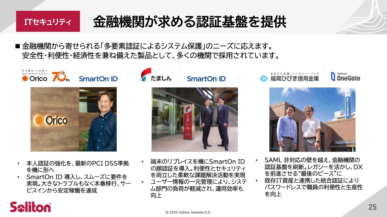 ①、②に関係してネットワーク認証製品である「NetAttest」ファミリーと「Soliton DNS Guard」、③から⑤に関しては「Soliton OneGate」「SmartOn」「Soliton SecureWorkspace」が該当します。今年度は文教分野で高い売上伸長を示しており、このトレンドは2026年度、2027年度にかけても続くとみています。