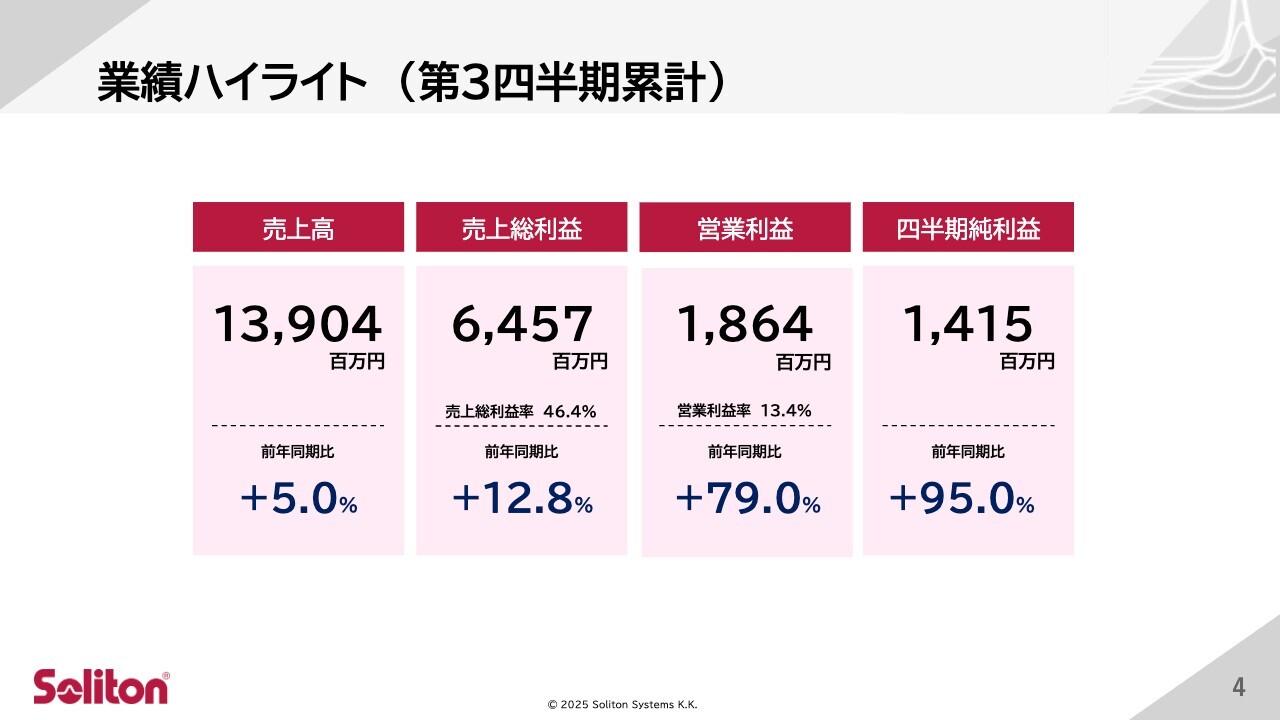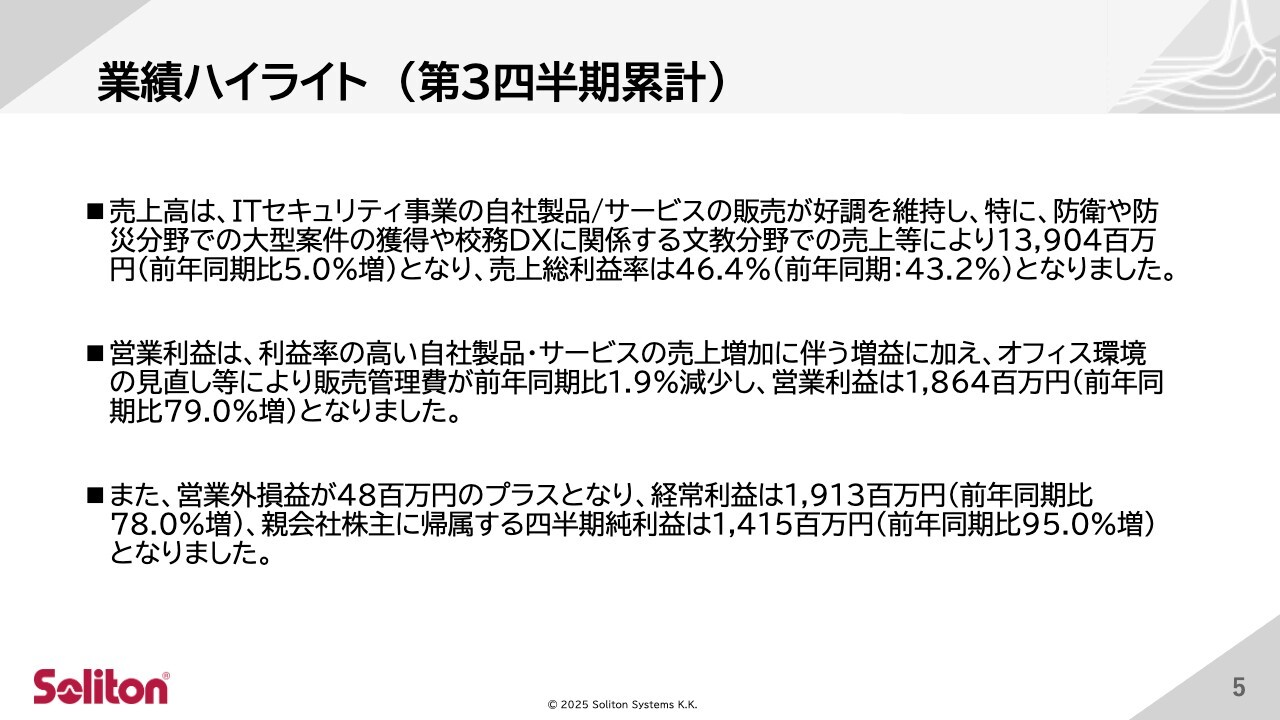 第3四半期のハイライトについてご説明します。売上高は、ITセキュリティ事業における自社製品およびサービスの販売が引き続き好調に推移しました。特に防衛や防災分野での大型案件の獲得や、校務DXに関連する文教分野での売上が寄与し、139億400万円と前年同期比で5パーセント増となりました。