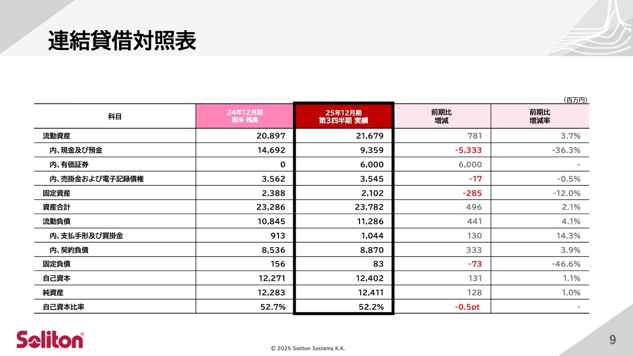 連結貸借対照表についてはスライドのとおりです。自己資本比率は引き続き50パーセント以上を維持しており、健全な財務体質を保っています。
