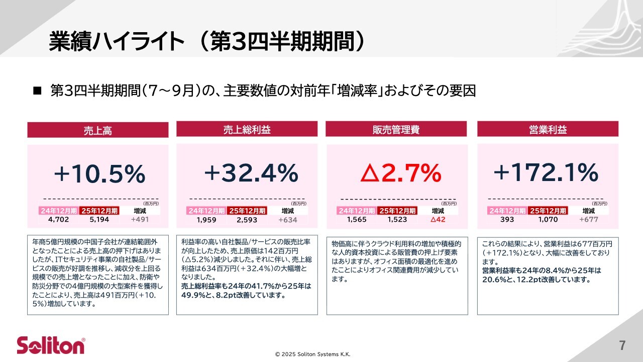 第3四半期単独の業績についてご説明します。売上高は前年同期比で10.5パーセント増加しました。中国子会社が連結対象外となった影響はありましたが、それを上回る規模でITセキュリティ事業の自社製品・サービスの販売が好調に推移したためです。特に、防衛や防災分野での大型案件の獲得が売上増加に貢献しています。