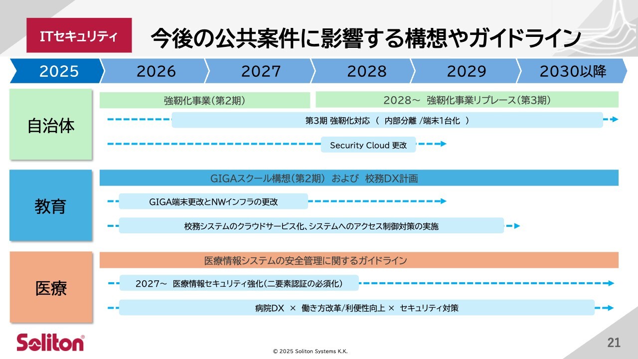 医療分野では、2027年度までに医療情報システムの多要素認証必須化への対応や、病院DXに広く関連したセキュリティ強化の案件需要が継続すると想定しています。