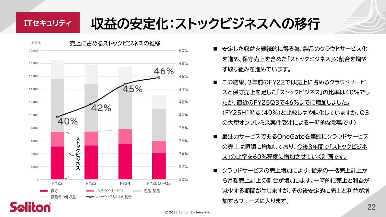 最注力サービスである「Soliton OneGate」を筆頭に、クラウドサービスの売上が順調に増加していることや、下半期から保守料金の値上げ効果が表れていることから、今後3年間でこのストックビジネスの比率を60パーセント程度に引き上げる計画です。