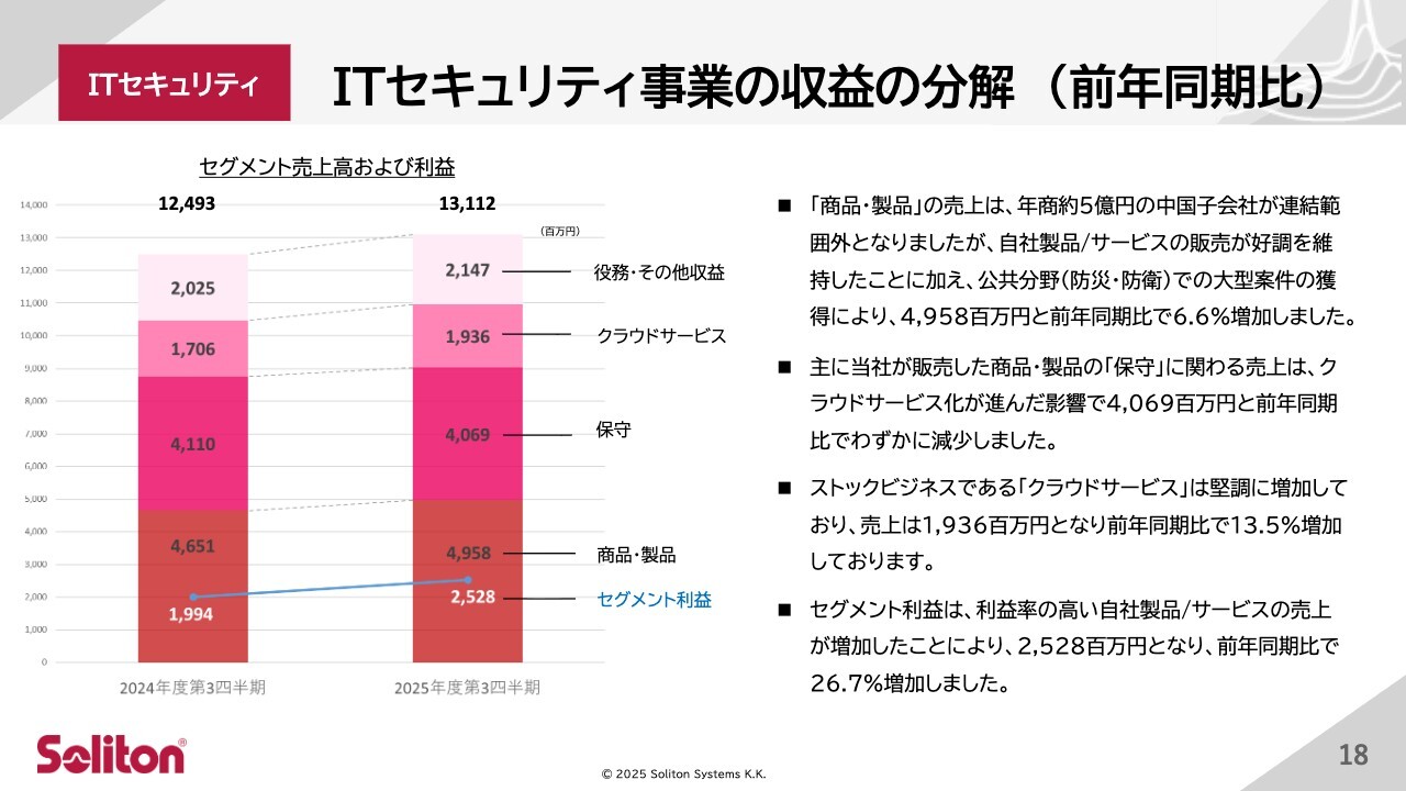 まずは、ITセキュリティ事業です。第3四半期の収益の前年同期比についてご説明します。商品・製品の売上は、中国子会社売却のマイナス影響がありましたが、自社製品やサービスの販売は好調を維持し、特に防災・防衛や文教といった公共分野が好調で、49億5,800万円となり、前年同期比6.6パーセント増加しました。