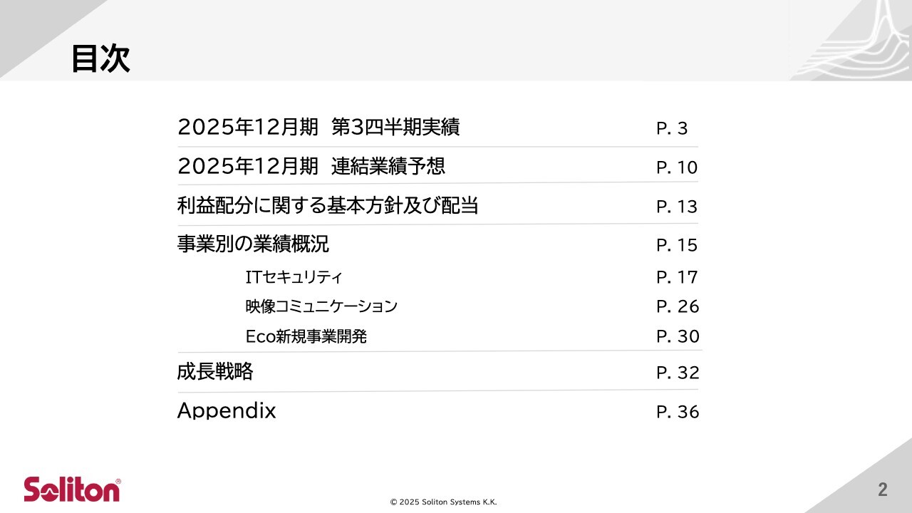 鎌田理氏:みなさま、こんにちは。ソリトンシステムズ代表取締役社長の鎌田です。当社グループの決算説明動画をご視聴いただき、ありがとうございます。本日は、2025年12月期第3四半期の業績および通期業績見通しの進捗状況をご報告し、後半では主要事業の概況と最近の重要トピック、成長戦略についてお話しします。
