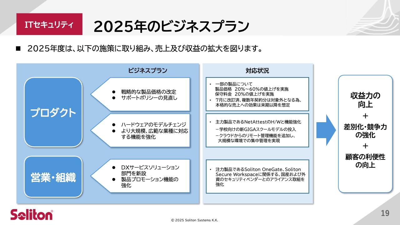 前のスライドでご説明したとおり、利益は前年同期比で大幅に改善しました。その背景にあるITセキュリティ事業の本年度ビジネスプランを再掲し、進捗をご説明します。まず製品については、値上げを含む戦略的な価格改定を行い、長期的にご利用いただきやすいよう、サポートポリシーも並行して進めています。