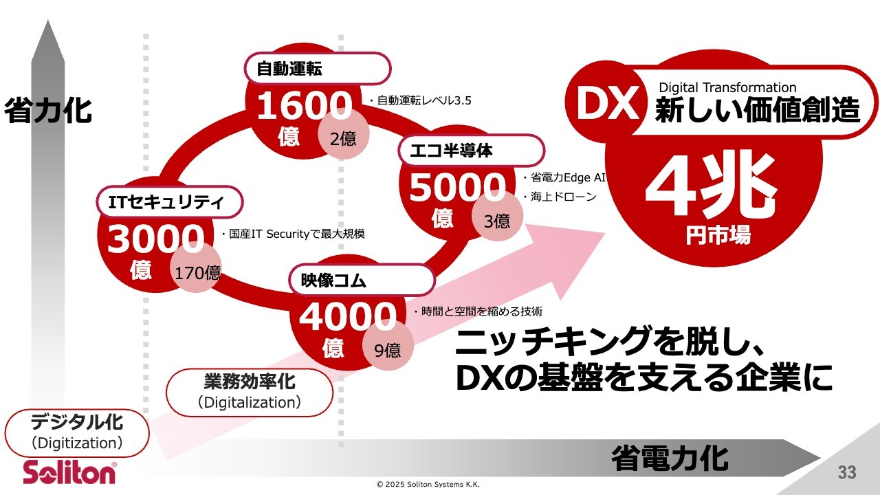 具体例としては、リアルタイム映像とセキュリティの融合や、自動運転と低消費電力AIの融合など、当社ならではのソリューションを提供します。これにより、DX市場の基盤を支える企業へと進化する予定です。