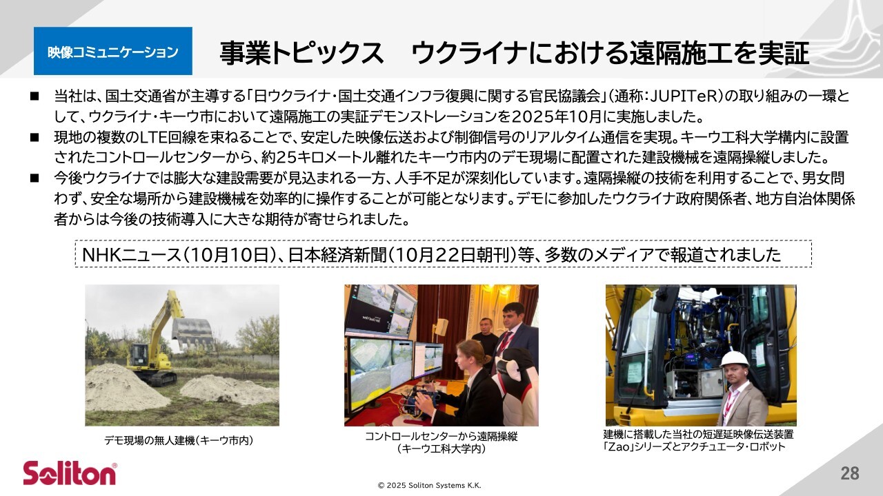 将来的な成長分野として注力している建機の遠隔操縦分野については、現時点では収益貢献は限定的ですが、引き合いが引き続き増加しています。