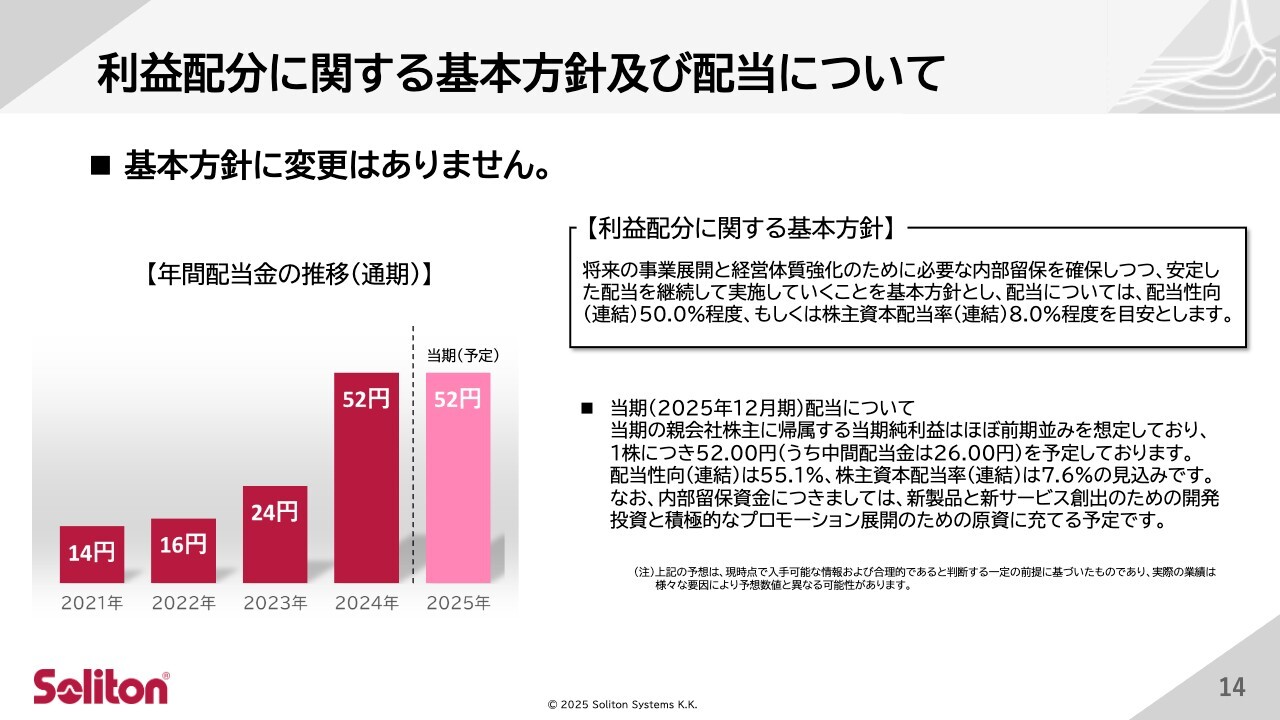 配当については、2024年度期末決算の内容として今年2月に開示した内容から変更はありません。1株当たり52円を予定しており、そのうち中間配当金26円は8月にすでにお支払い済みです。