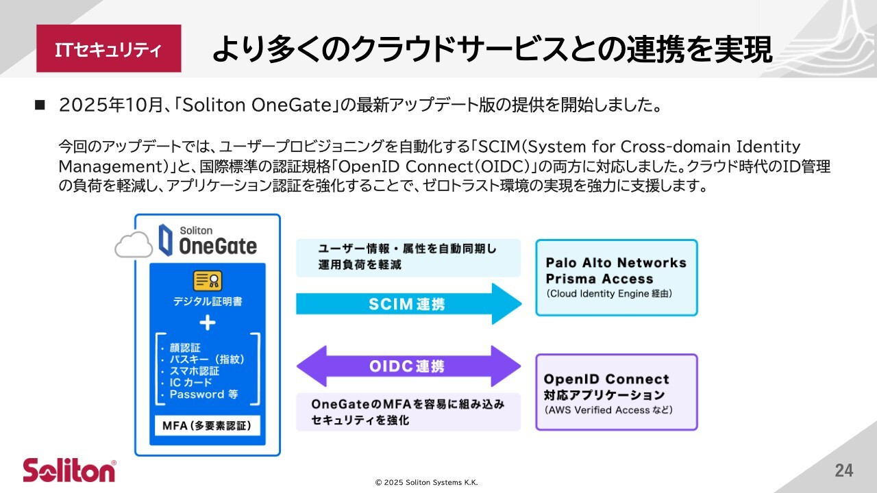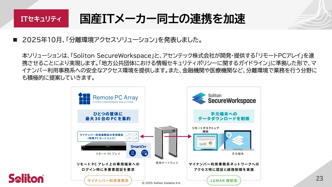 注力製品である「Soliton OneGate」「Soliton SecureWorkspace」に関連し、国産セキュリティベンダーとのアライアンスを大幅に強化しました。これにより、技術連携と市場拡大を推進しています。