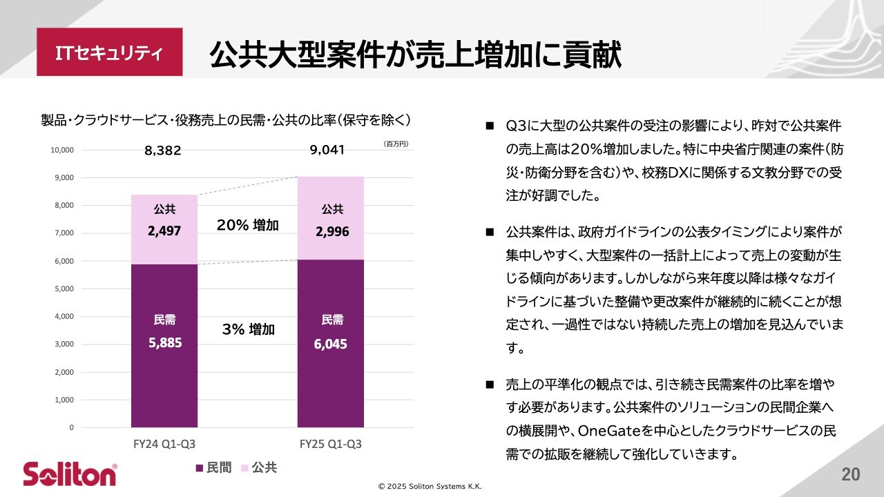 スライドでは、保守を除いた民需と公共の売上高を前年同期で比較しています。第3四半期には公共分野で大型案件を受注し、公共分野の売上が前年同期比で20パーセント増加しました。