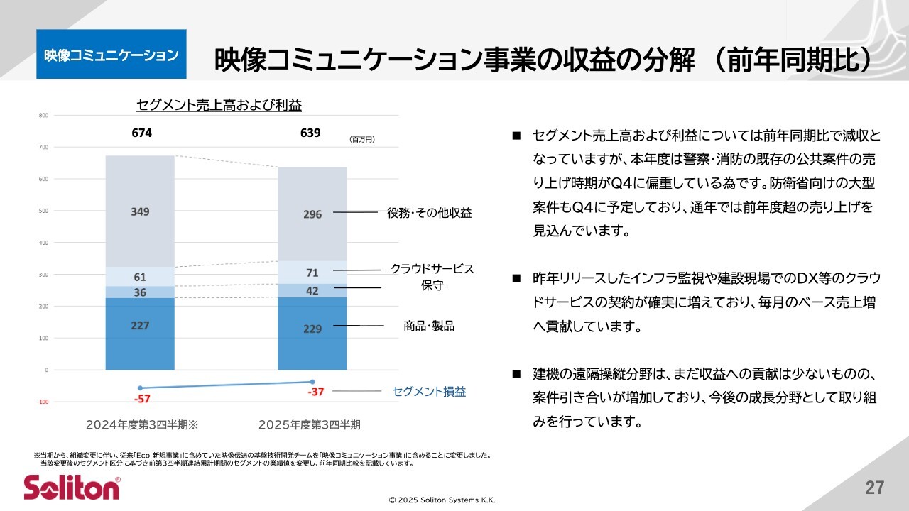 続いて、映像コミュニケーション事業部の概況についてご説明します。映像コミュニケーション事業全体の売上高は前年同期比で減収となっていますが、これは警察や消防関係の既存の公共案件の売上時期が第4四半期に集中しているためです。