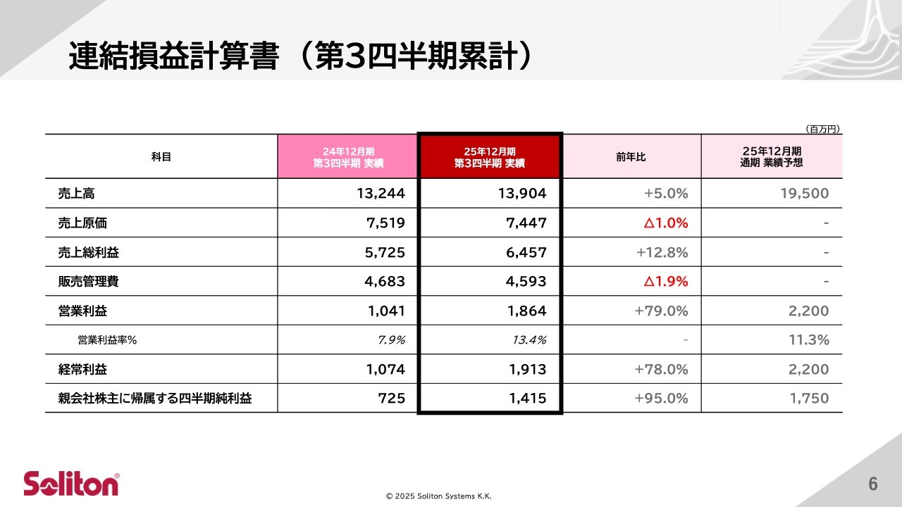 それでは、2025年12月期第3四半期の実績についてご説明します。連結業績のサマリーはスライドのとおりです。