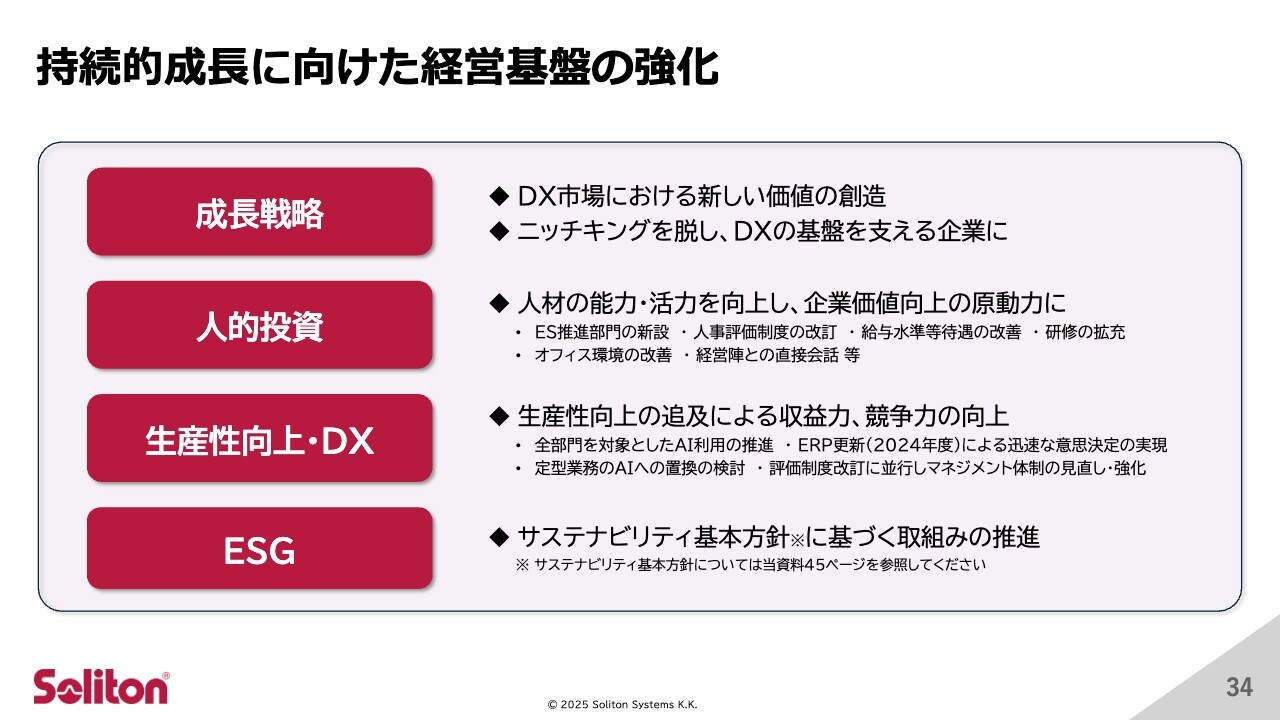 成長戦略に基づき、持続的成長に向けた経営基盤の強化を進めています。まず、DX市場を見据えた具体的な成長戦略の策定に取り組んでいます。また、人材の能力や活力を向上させ、企業価値の向上を図るための人的投資を強化しています。