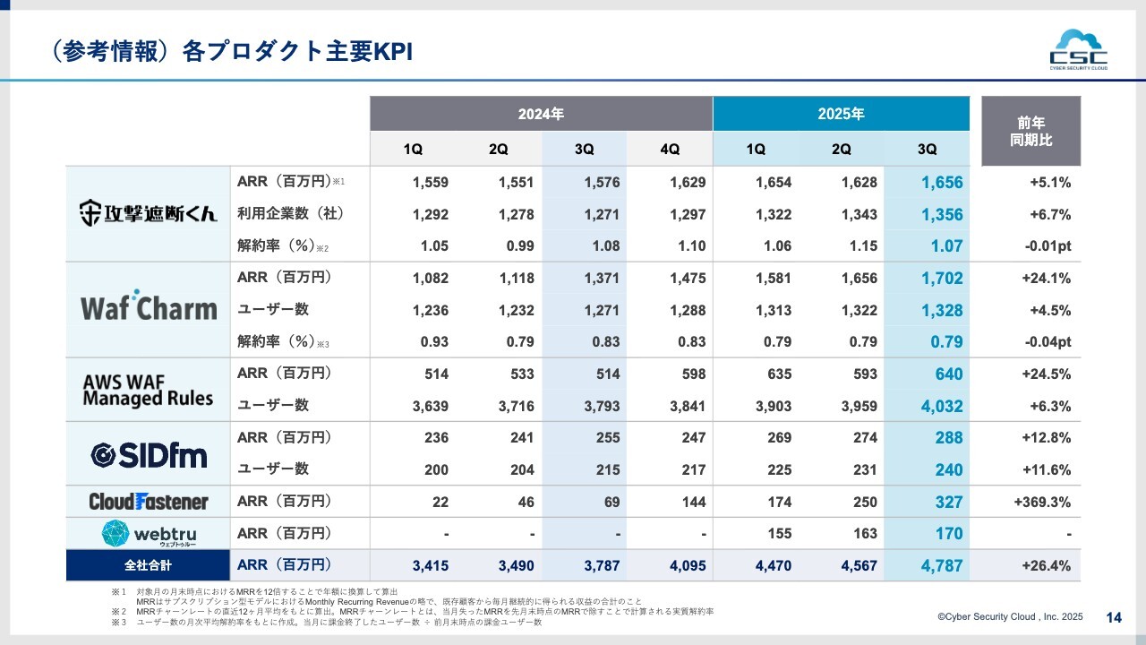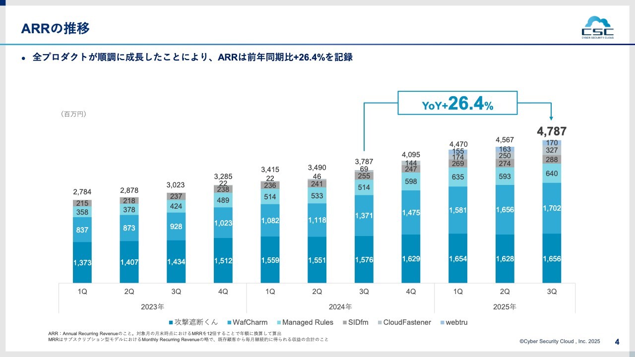 ARRの推移です。それぞれのプロダクトは順調に成長し、前年同期比でプラス26.4パーセントとなっています。