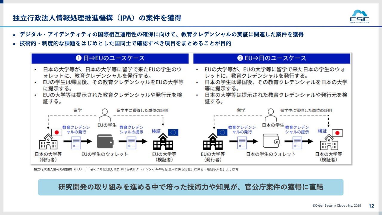 独立行政法人情報処理推進機構(IPA)から案件を受託した件についてです。まず、サイバーセキュリティクラウドとして、中長期的な方向性やさまざまな可能性を模索する研究の一環として、今回この案件の獲得に至ったと考えています。