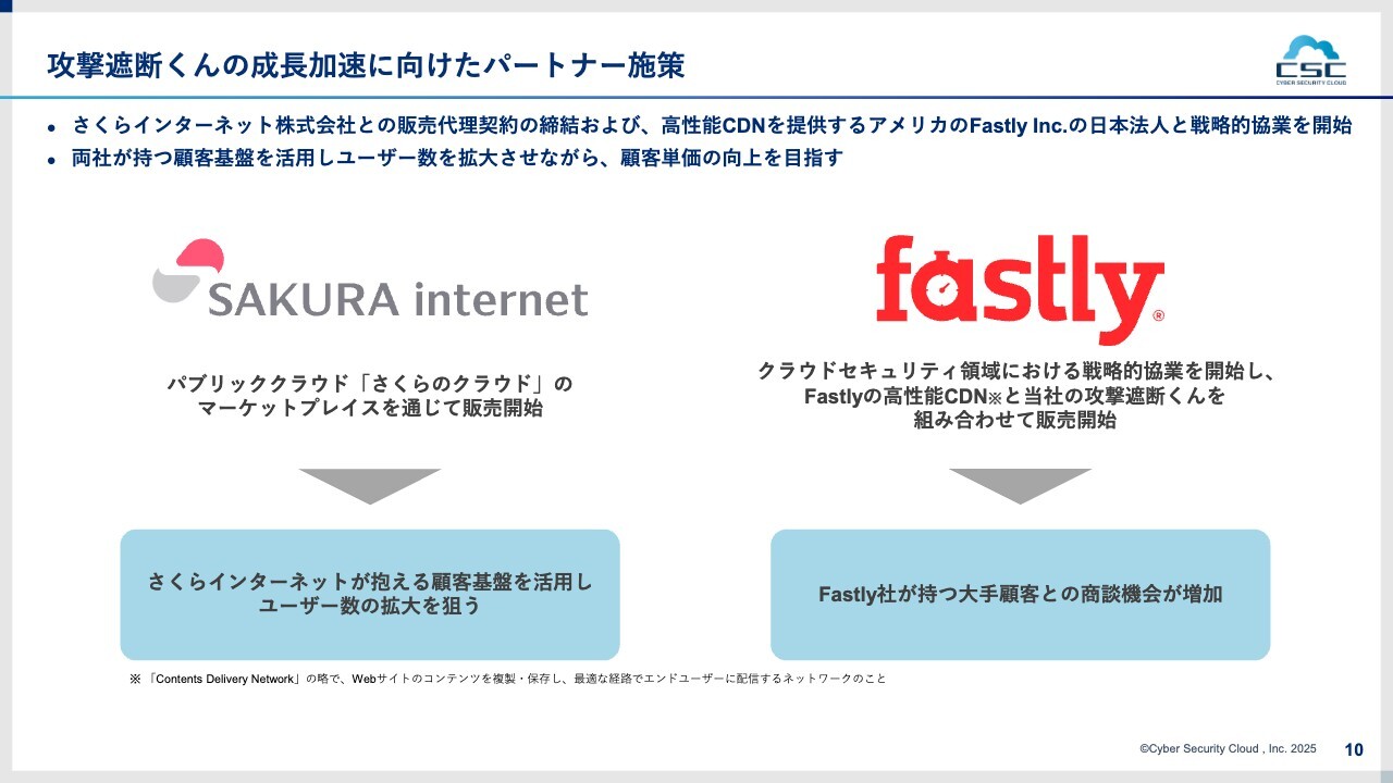 また、Fastlyとの戦略的な協業も開始しています。細かな技術的な部分は割愛しますが、Fastlyは非常に高い性能を持つCDNというネットワーク技術を提供しています。彼らのCDNと当社の「攻撃遮断くん」を組み合わせることで、セキュリティ精度の高いネットワークを構築することを目指し、今後、一緒に取り組みを進めていきます。
