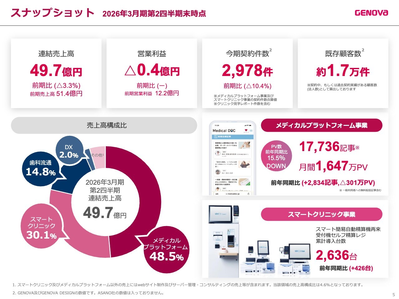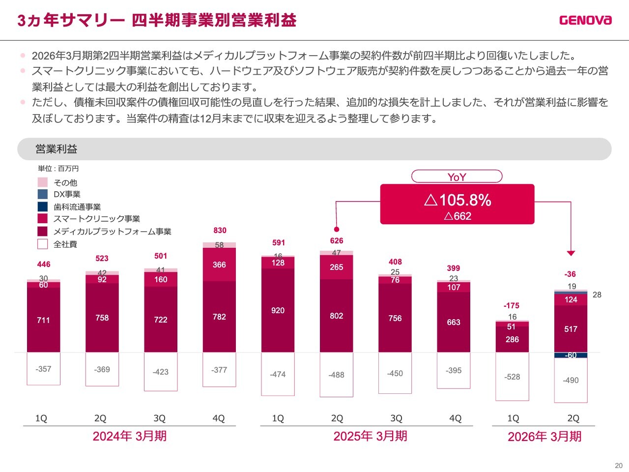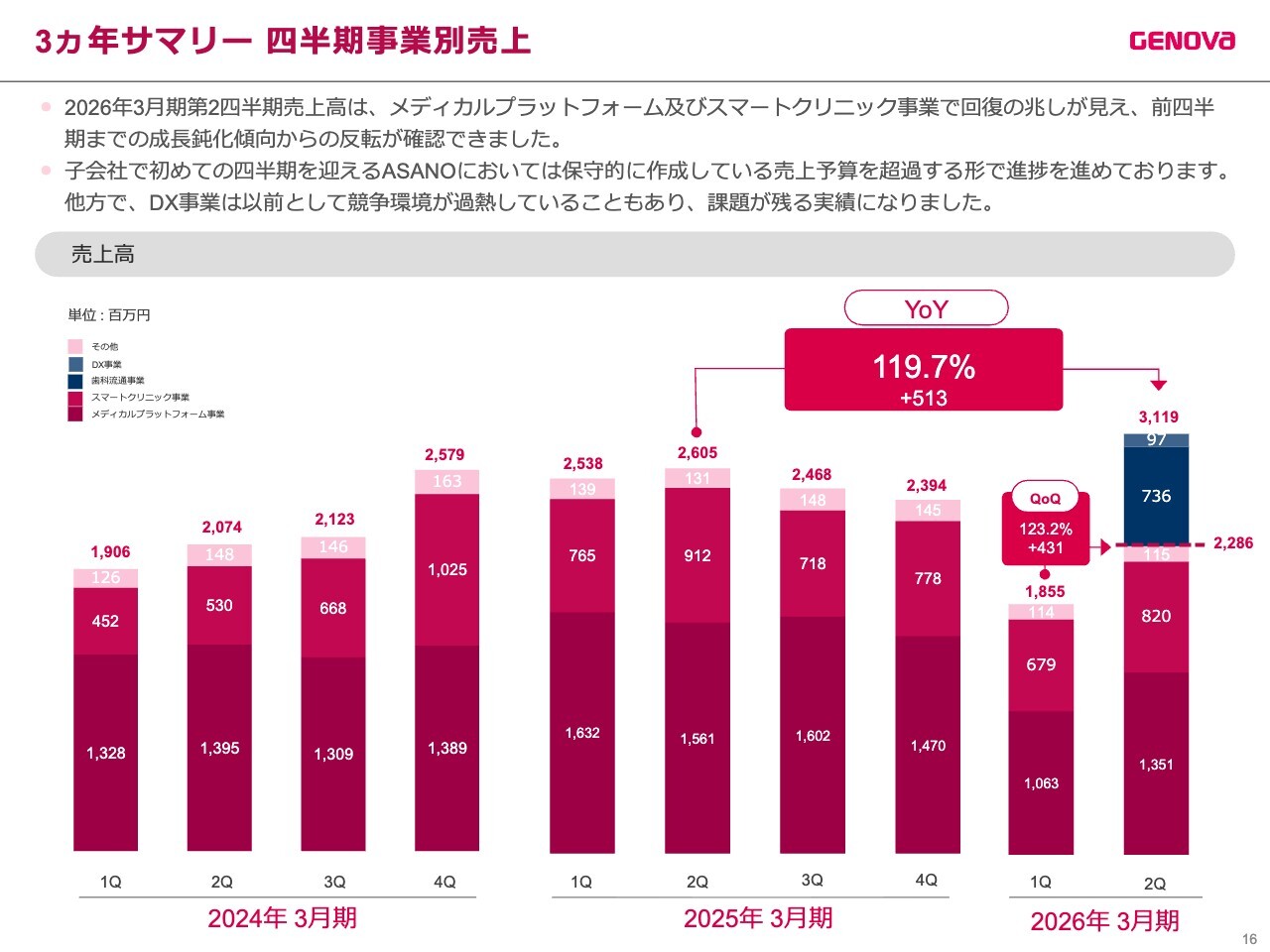 2026年3月期第2四半期の売上高は、「メディカルプラットフォーム事業」および「スマートクリニック事業」で回復の兆しが見られ、前四半期までの成長鈍化傾向から反転したことが確認されました。