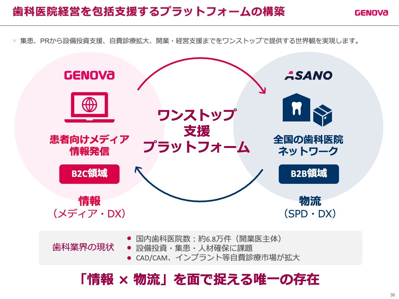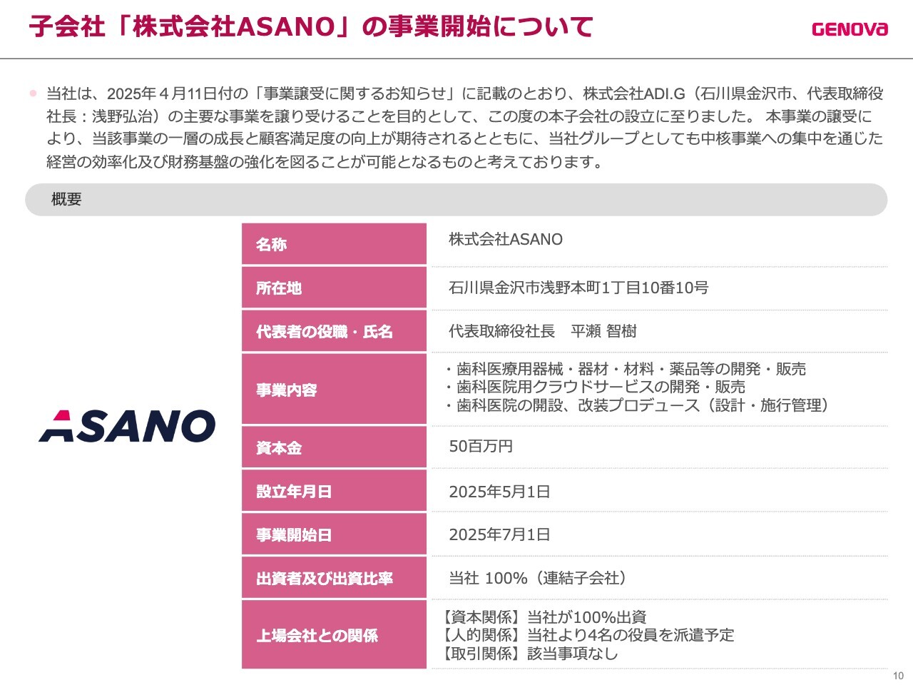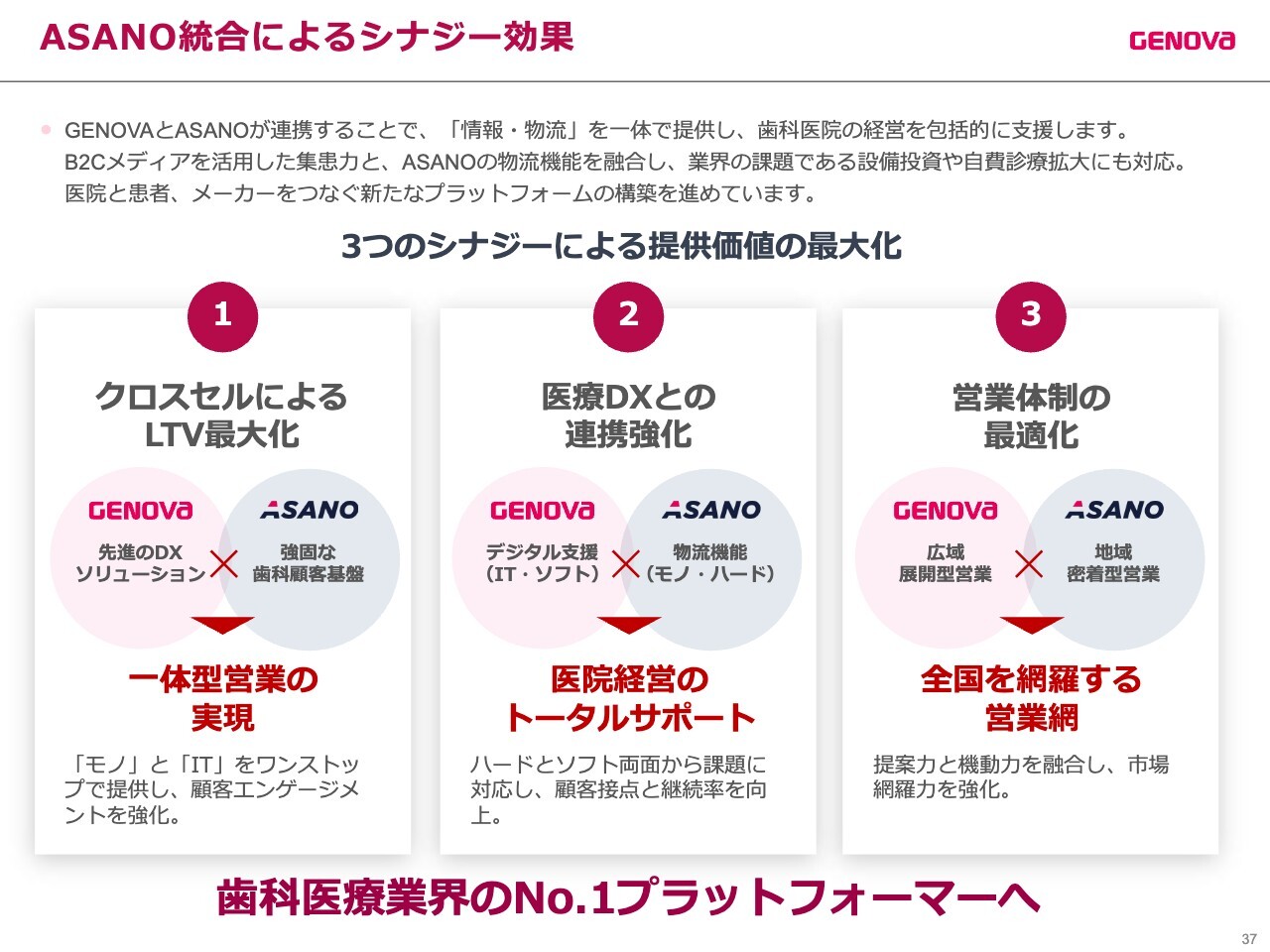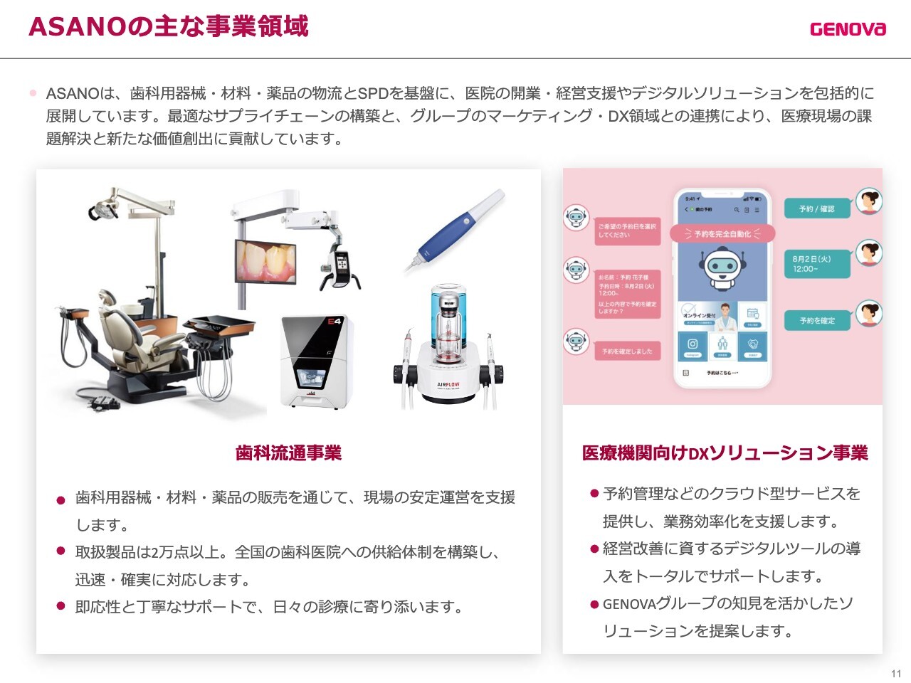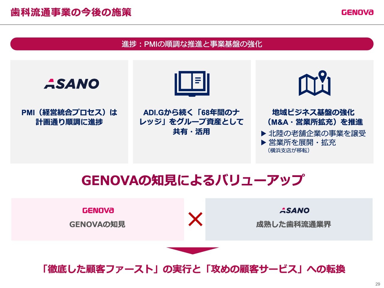 経営統合についてお話しします。こちらのスライドはASANO社についてですが、PMIは順調に進捗しており、今後GENOVAとのシナジーが期待されます。ASANO社は歯科専門商社であり、この歯科部門においてシナジーを生んでいきたいと考えています。