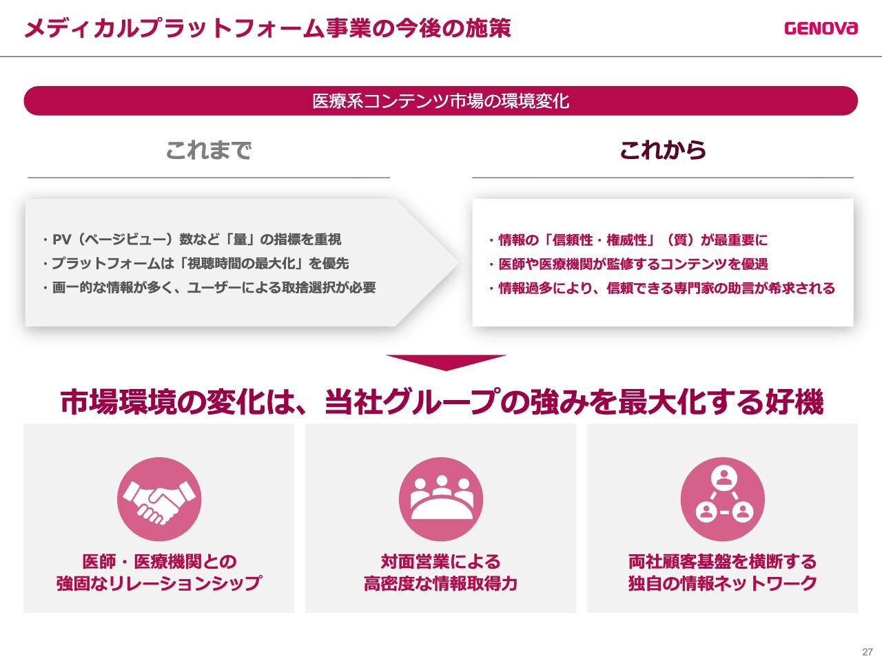 現在、医療系コンテンツ市場はPV数などの量を重視する環境から、情報の信頼性や権威性、つまり質を重視する環境へと変化しています。この変化は、当社グループが持つ医師や医療機関との強固なリレーションシップと、高密度な情報取得の最大限に活かす好機であると捉えています。