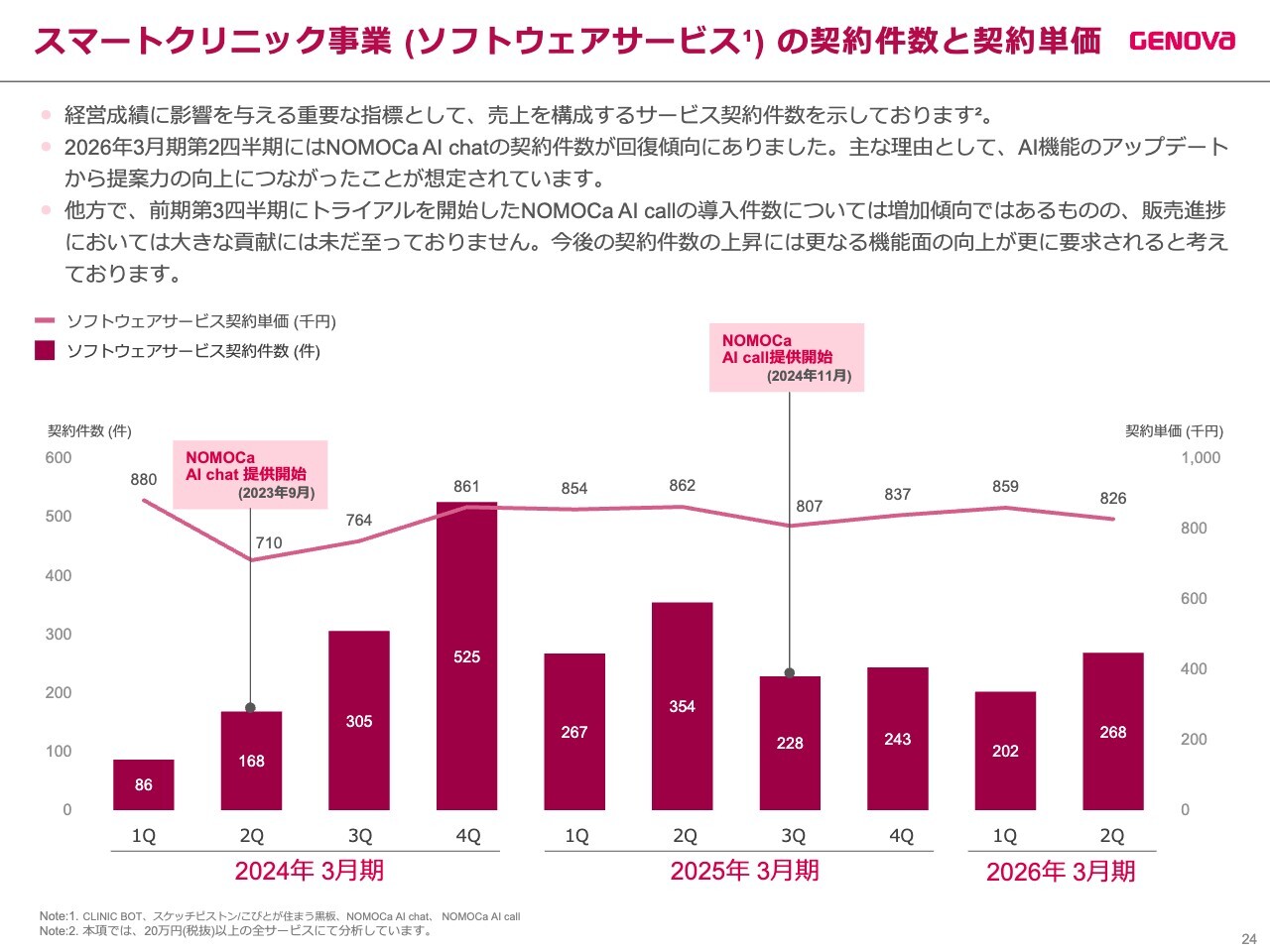 2026年3月期第2四半期において、「NOMOCa AI chat」の契約件数は回復傾向にありました。この主な要因として、AI機能のアップデートによる提案力向上が想定されています。