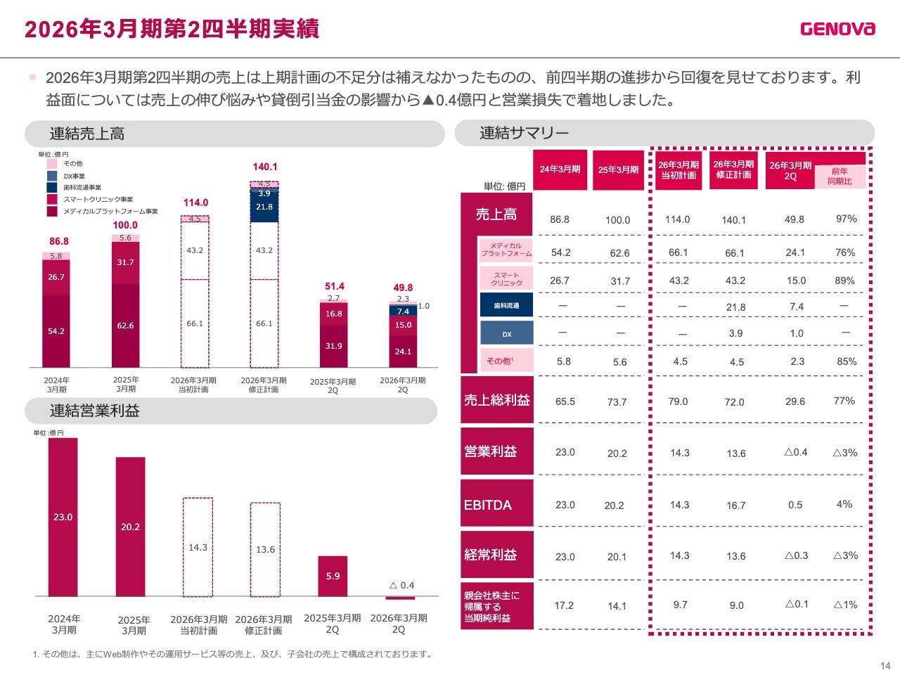 2026年3月期第2四半期の連結売上高は49億7,000万円、営業利益はマイナス4,000万円となりました。